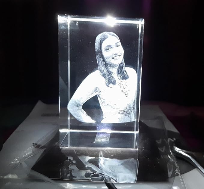 This is beautiful solid crystal with 3D photo inside which appears to be floating inside. Your personalized 2D photo would be created inside the crystal using laser engraving technique which produces a high quality item which can be used as a home decor, gift item for any occasions or for recognition award. The clear solid optical crystal is free of any bubbles. "Dharani Gifts, experts in providing High quality crystal. Create deep laser engraving in crystal cube, If you have any additional questions or clarifications. Note:- Battery is not included and no music option in LED light base. Rectangle Cube shaped crystal with 3d photo inside with free light base, 3d laser engraved crystals, anniversary, baby shower, birthdays, christmas, congratulation, friendship day, gift for bride, gift for brother, gift for daughter, gift for fiance, gift for girlfriend, gift for her, gift for him, gift for husband, gift for kid girls, gift for mother, gift for sister, gift for son, gift for toddler, gift for uncle and aunt, house warming, love, miss you, mothers day, neighbours, new baby, rakshabandhan, relatives, sorry gifts, thank you, valentine day, wedding.